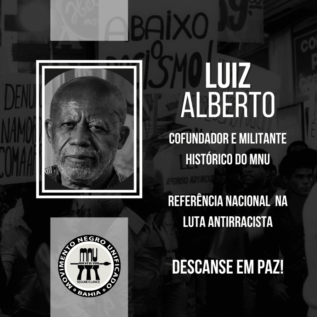 Luiz Alberto, presente! ✊🏾 Com muita tristeza, o MNU Bahia informa o falecimento de Luiz Alberto, Cofundador do MNU Bahia e militante histórico da luta